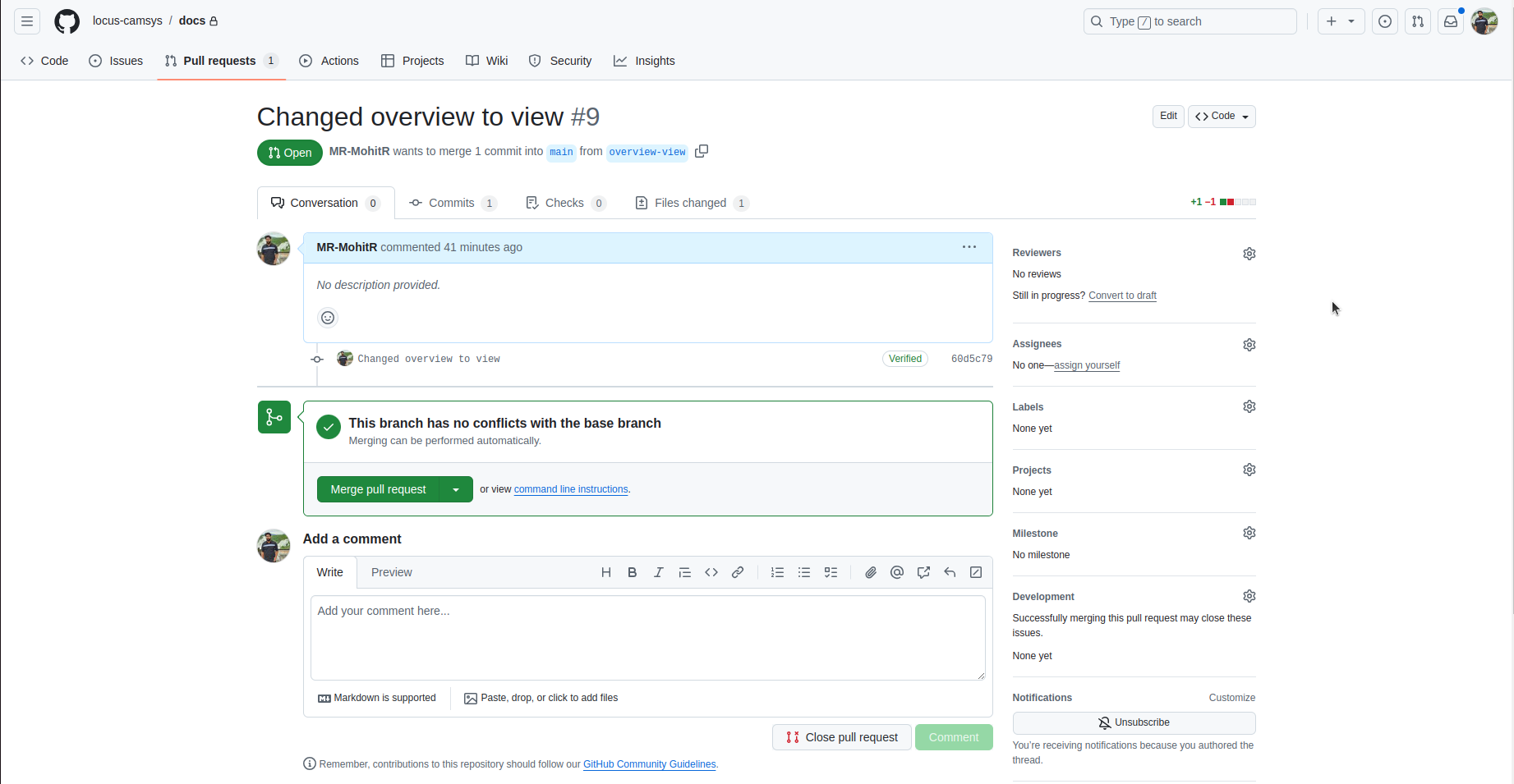 - Once a PR is approved, you can Merge it into the main branch by clicking Merge pull request.