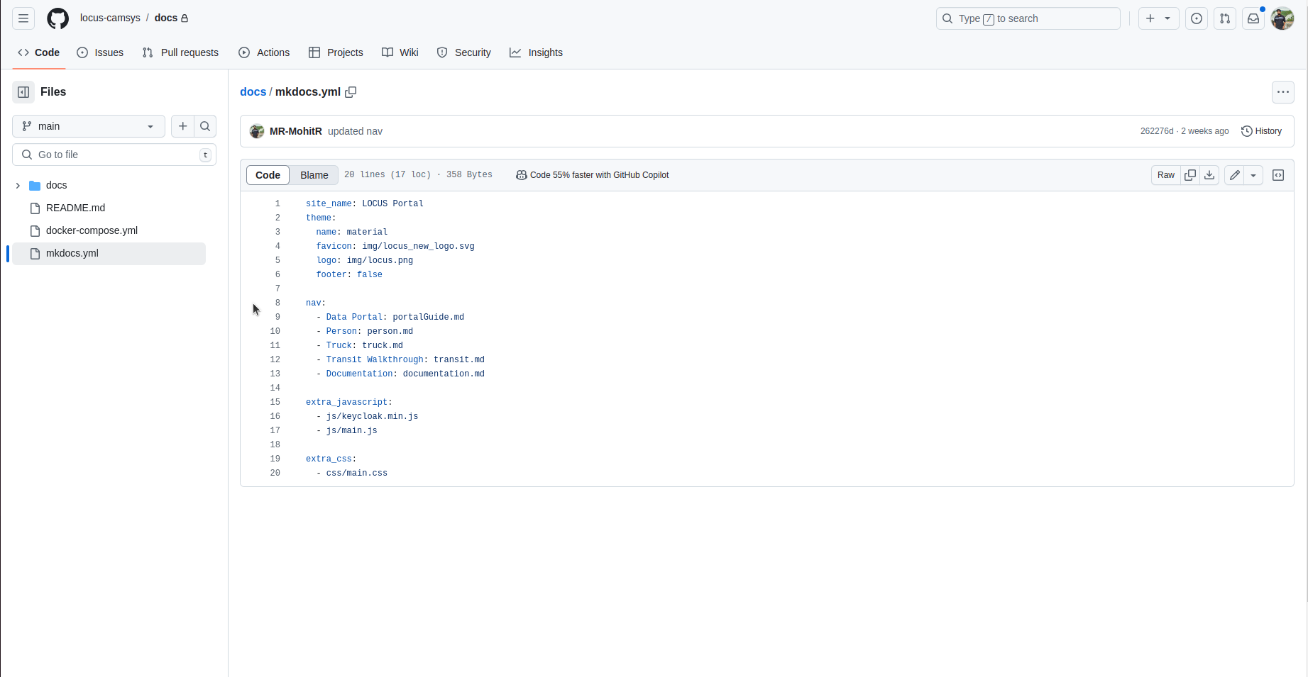 - Open the mkdocs.yaml file, located in the root of the repository.
