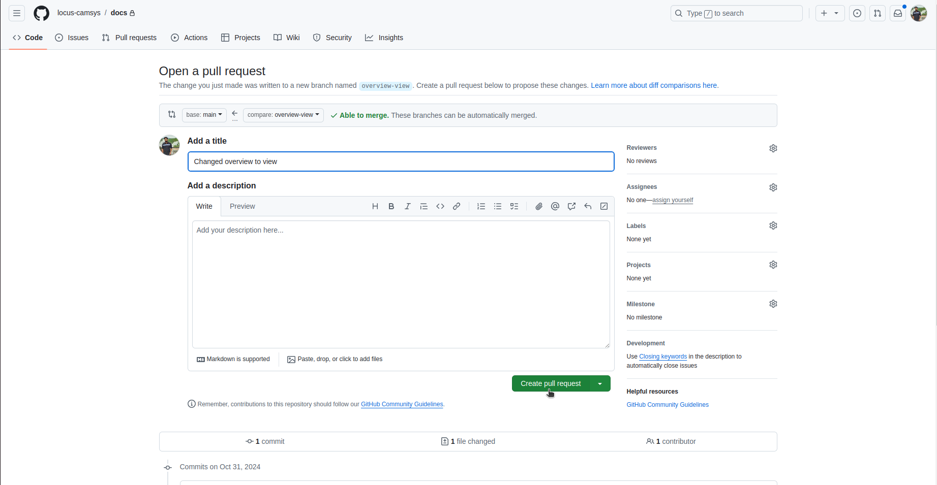 4. You'll be redirected to the Open a pull request page, where you can review the changes. Add a clear description summarizing your updates, then click Create pull request.