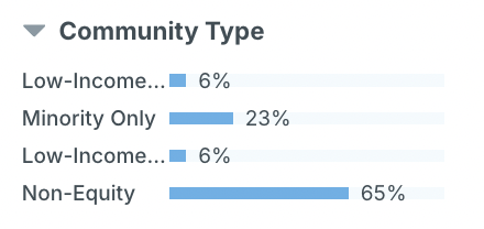 The community type is a LOCUS device or transit farecard user-based chart. Community type tags are based on trip ends; if either the origin or the destination of a trip falls under a specific community type group, then that trip is associated with the corresponding community type. The default definitions for these communities represent geographic areas of concerns based on income, equity status, and other socio-demographic attributes if required. If the user specifies their own community type definition, the community type chart will differ based on the information inputted.