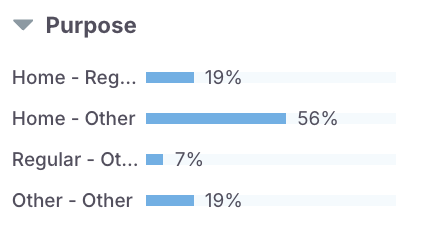- Regular - Other: captures trips between the non-home regular location and a non-home location. This captures trips such as going to/from lunch from/to the workplace, stopping on the way back from work to pick up a child from daycare, and/or going to a part-time work location after university classes.