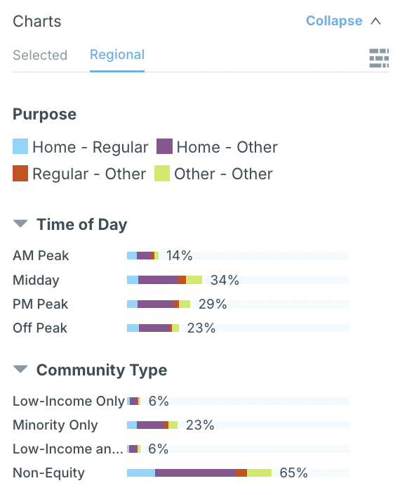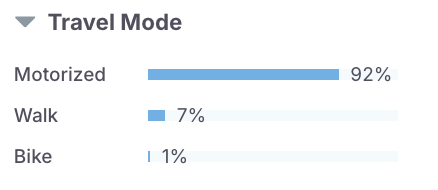 These charts allow users to segment the analysis based on three travel modes. Note that motorized travel captures trips made using both auto and transit.