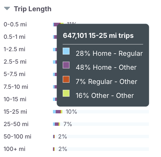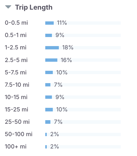 This chart segments trips according to trip length. The trip lengths are the great-circle distances from origin to destination factored by network complexities to represent real-world network distances.