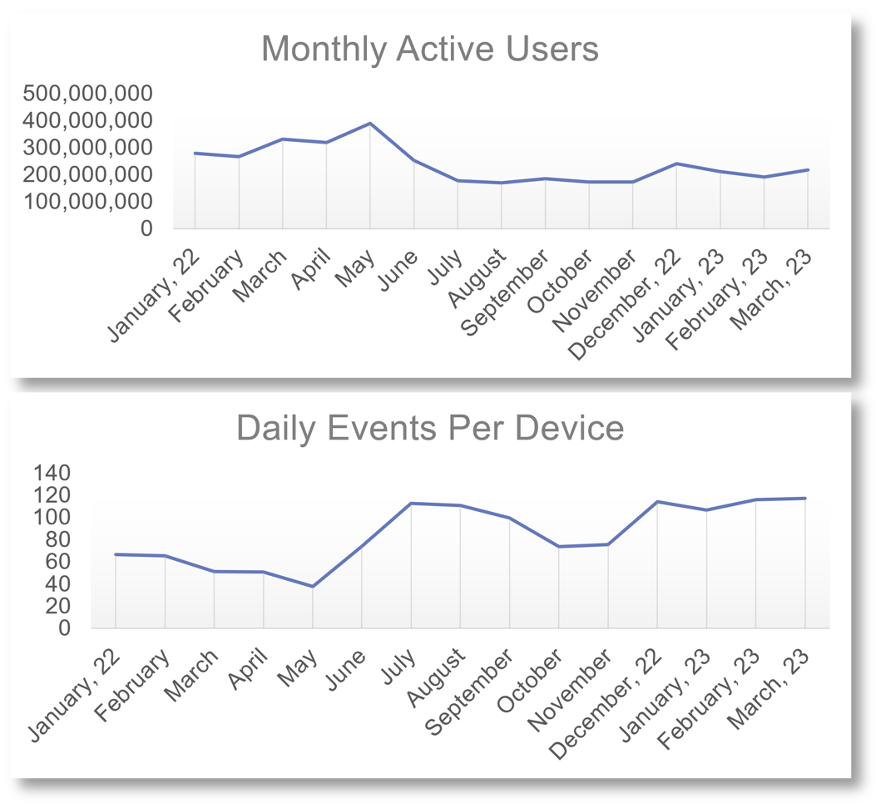The figure below show the changes in our data streams between 2022 and 2023 – there is a drop around the iOS changes on data sharing across apps in June 2022, but our data streams have since stabilized, with increase in the daily events per device. Our penetration rate with the valid devices (with the most robust data) in 2023 was between 6-10% of the total population.