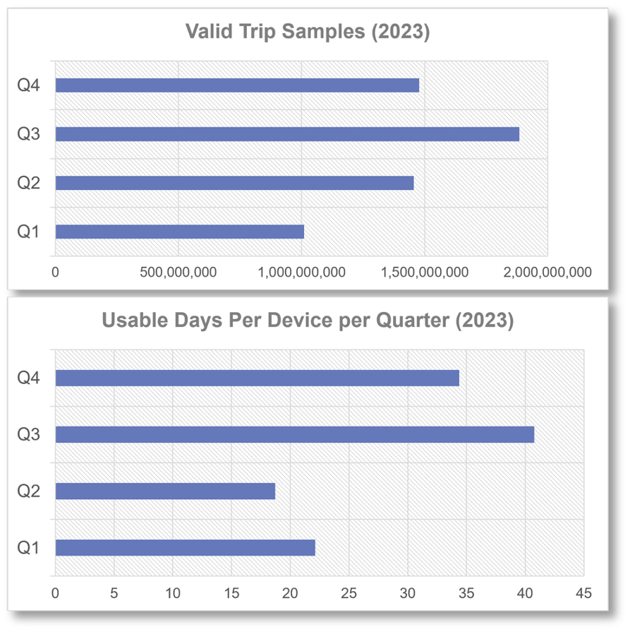 The next figure shows the trips and usable days per valid device per quarter in 2023. On average, we get between 20 and 40 days of rich travel information per device, allowing us to build high-quality movement analytics.