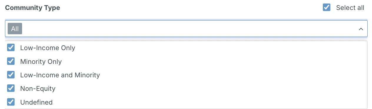 Consider community type aspects by filtering data based on the equity, minority, or low-income status of travelers. The available options are the default community type classification, based on the Justice 40 equity definition, and a user-defined custom community type table.