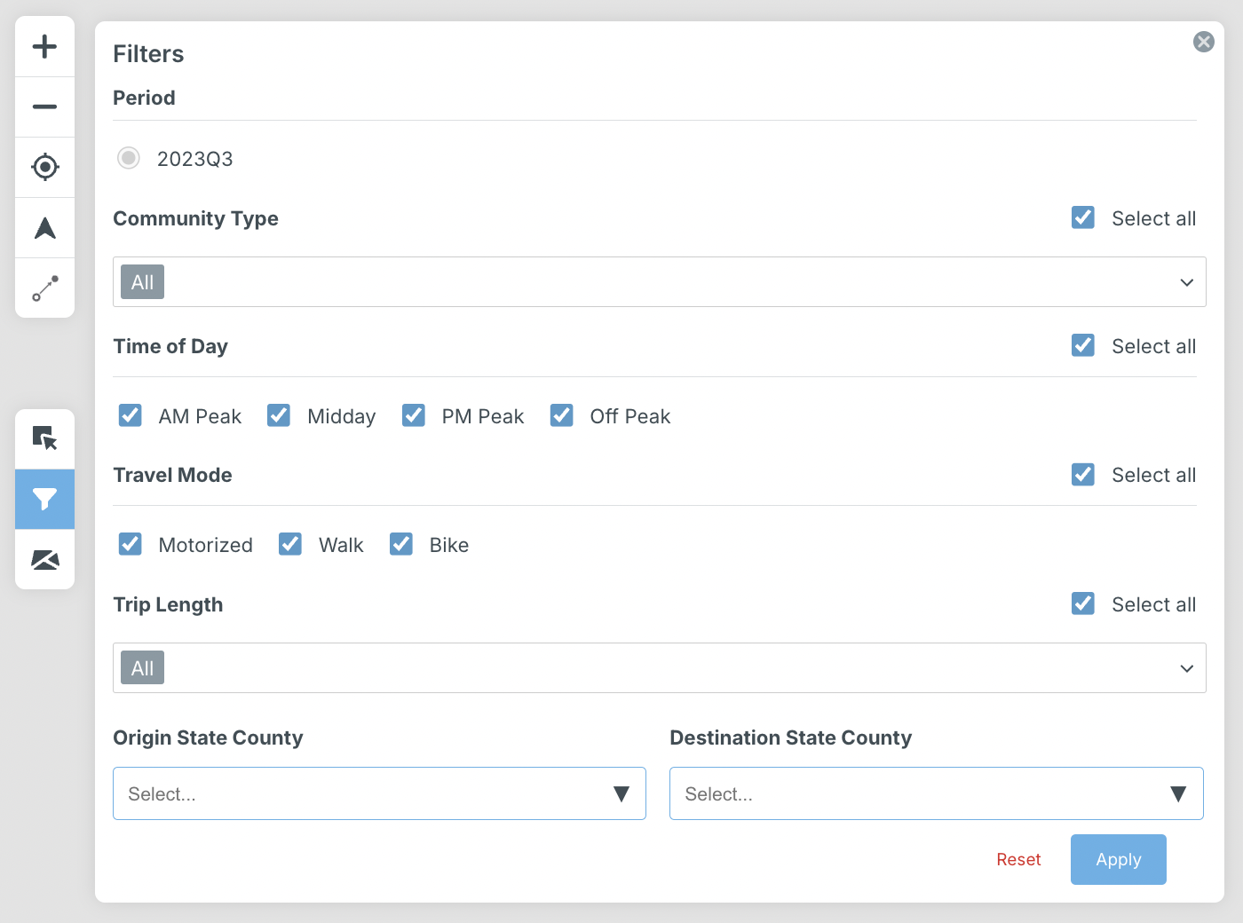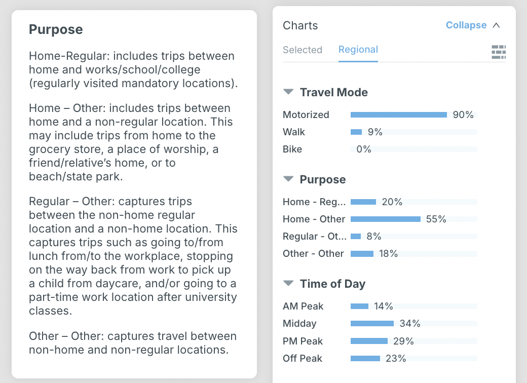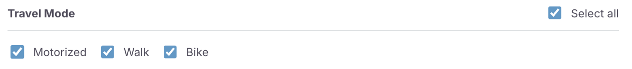 Choose between motorized, walk, or bike trips to focus on specific modes of transportation.