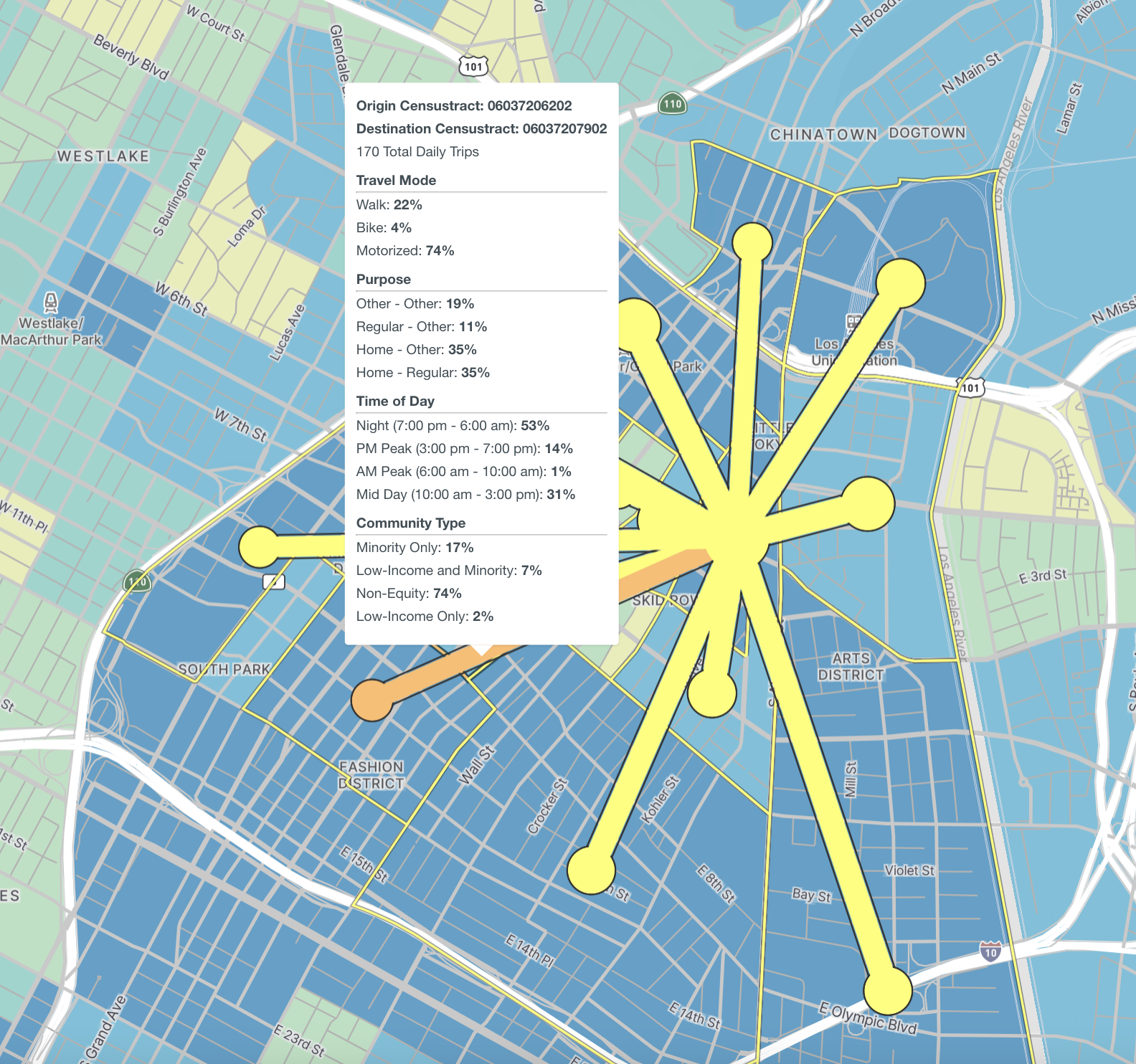 Hovering over different areas on the map will reveal information about the area in question. Hovering over the map will reveal high level metrics and mode share breakdowns for the selected area.
