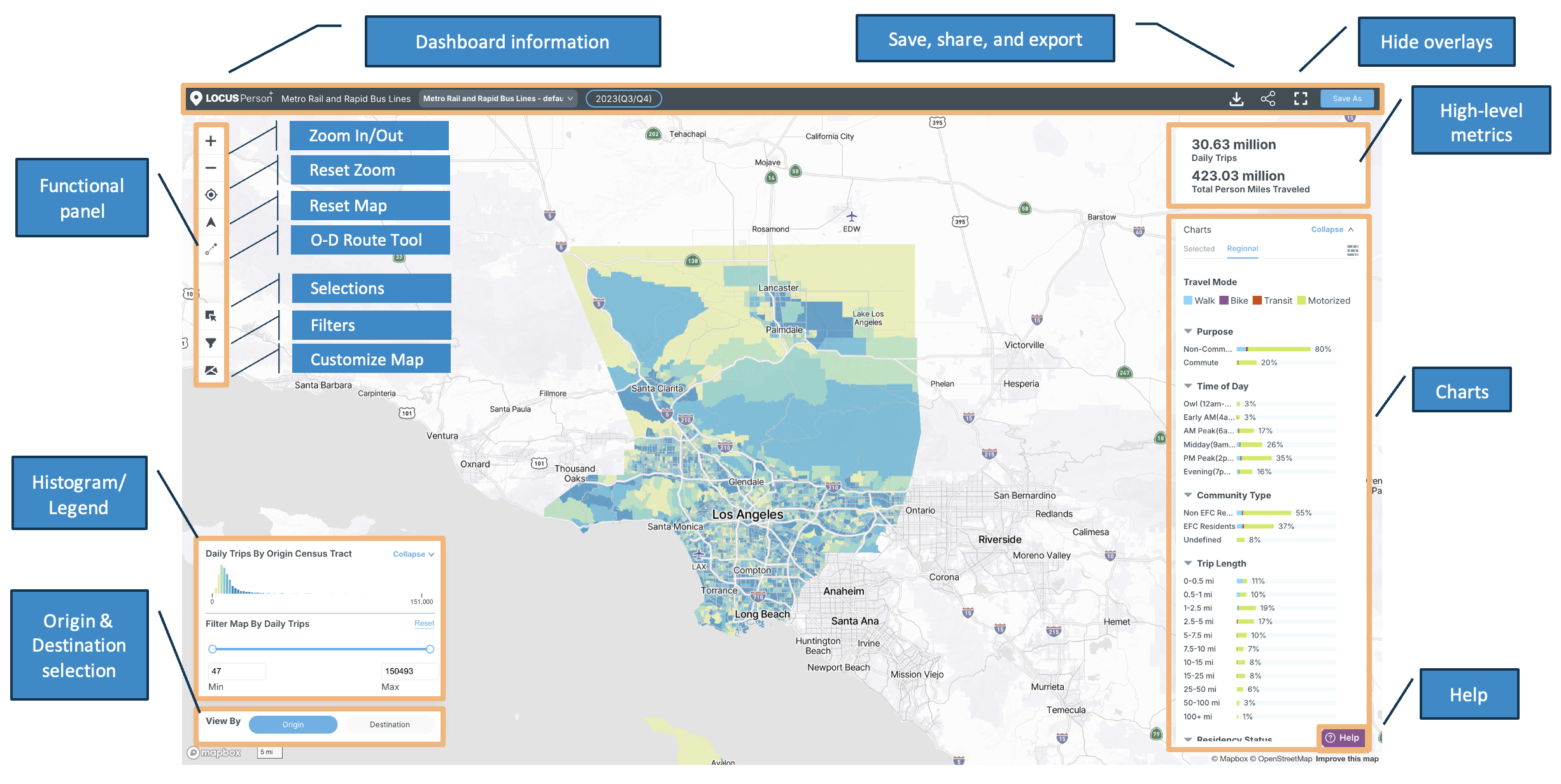 : Easily interpret data metrics such as daily trips, person miles traveled, trip shares, and trip density.Save, Share, and Export