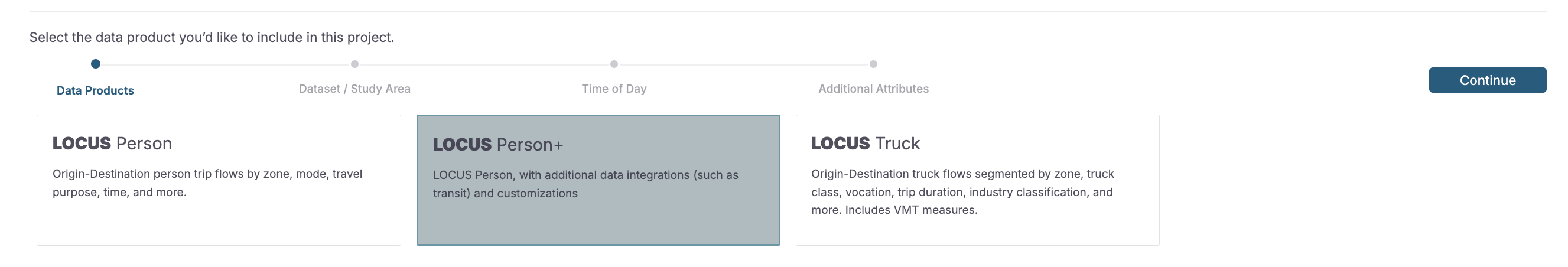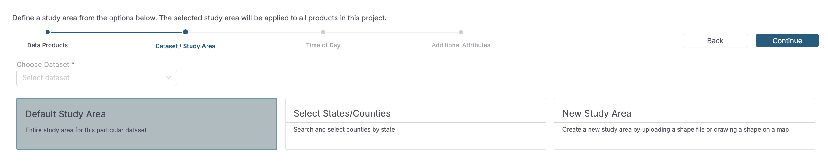 Step 2: Specify a dataset/study area for your project. This selection will apply to all products, dashboards, and views within this project. These selections contain only the datasets that have been purchased by you.