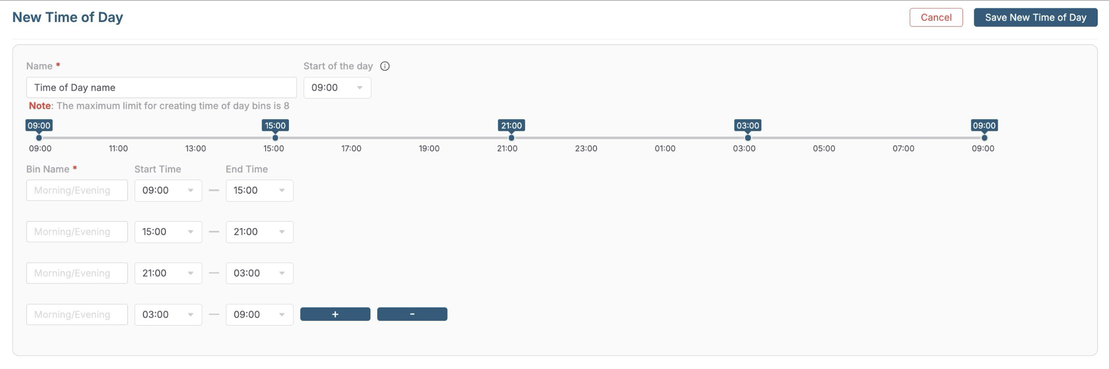 Step 3: Create as many discrete intervals as needed. Use the + and - buttons to create or delete a new time-of-day bin.