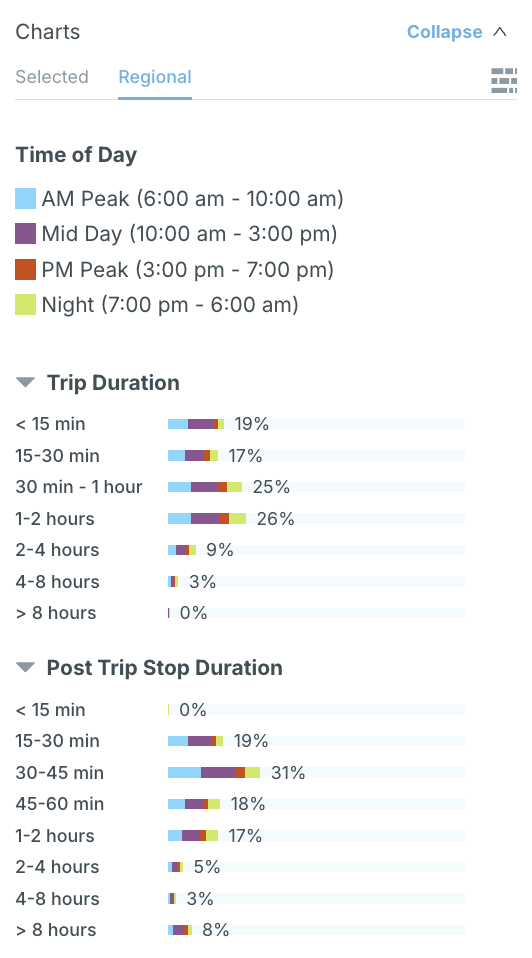 Segment charts by time of day, vehicle class, vocation, community type, and trip end type. The below example shows charts segmented by time of day.
