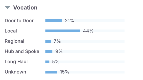 - Local: The vehicle's range of activity is below 150-air-miles (regardless of miles traveled), thus qualifies for the short-haul exemption under Hours of Service Regulations. This is measured over a given 3-month period. In addition, the vehicle does not exhibit behavior in line with other vocations, such as hub-and-spoke and door-to-door. Examples include HVAC and beverage distribution.