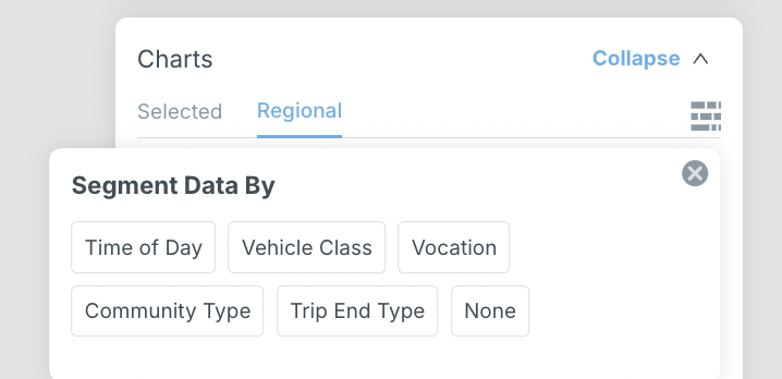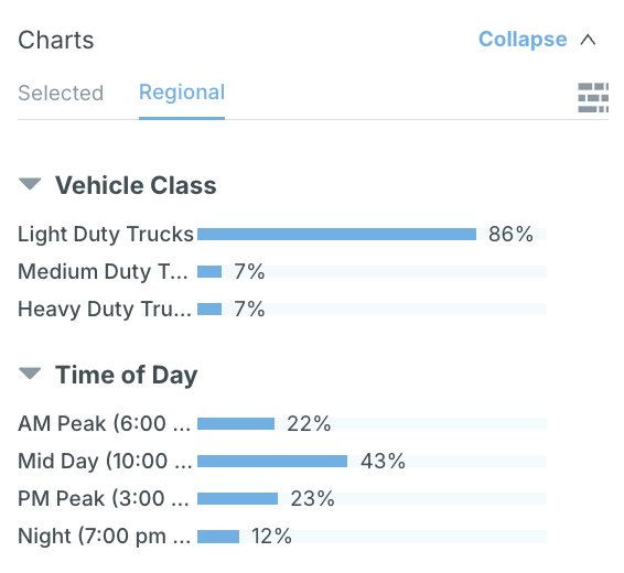 The “Charts” panel is collapsible. This panel reveals metrics on either a regional level, or on a geographic selection level (i.e., metrics that pertain to a particular area selected on the map). The filters apply to both regional and selected panels. These charts can also be segmented further to reveal relational insights.
