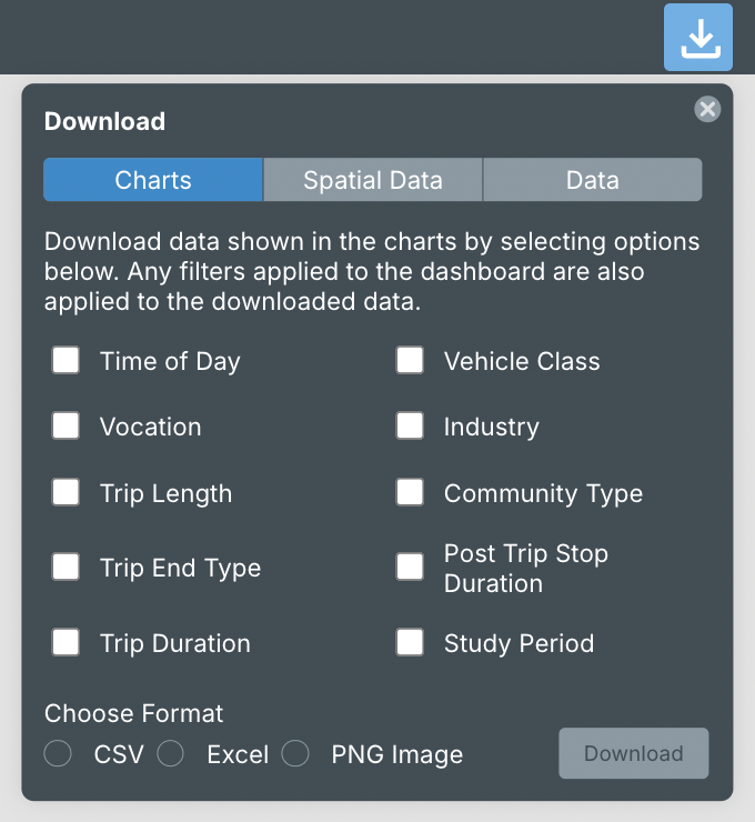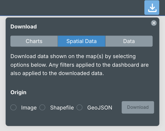 Download data in multiple formats using the “download” button. Information for charts, the map, and dashboard data can be downloaded.