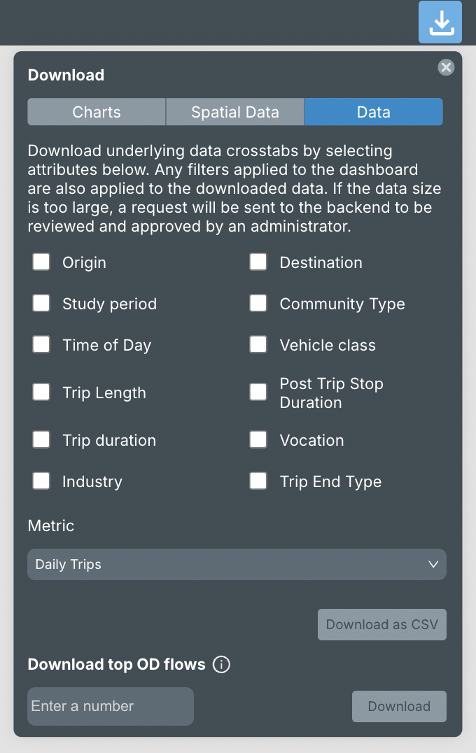 Export cross-tabulated data by selecting up to 3 fields to download data for, as well as the metric you wish to explore in relation to this information from the dropdown. If more than 3 attributes are selected, or if both origin and destination attributes are selected, the data request will be reviewed by an administrator before approval. All filters applied on the dashboard are also applied to the downloaded data. Export as a CSV or Excel file. Download up to 5000 top OD flows.