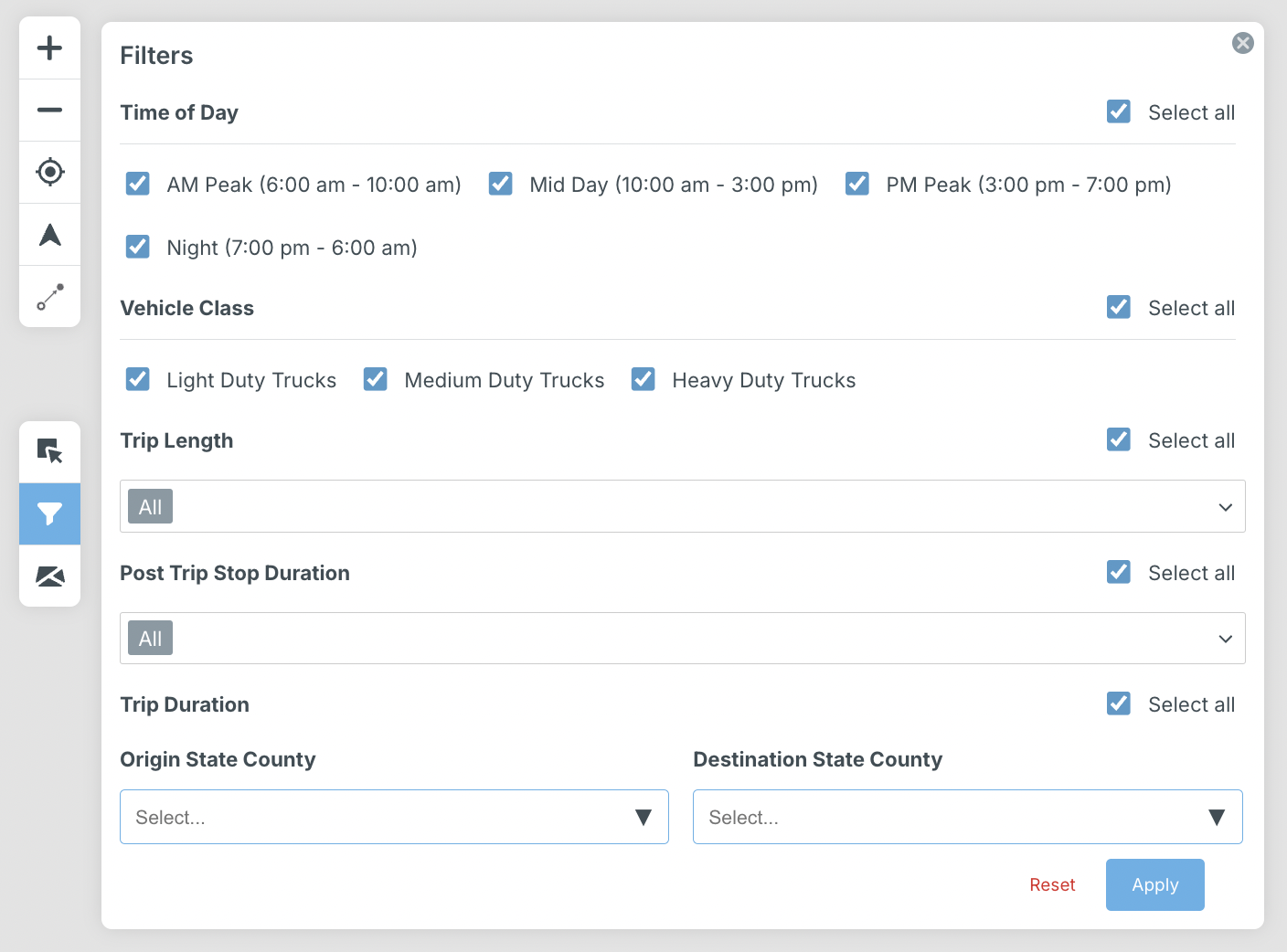 You can filter data based on study period, community type, time of day, vehicle classification, trip length, post trip stop duration, trip duration, vocation, industry, trip end type, origin state county, and destination state county.