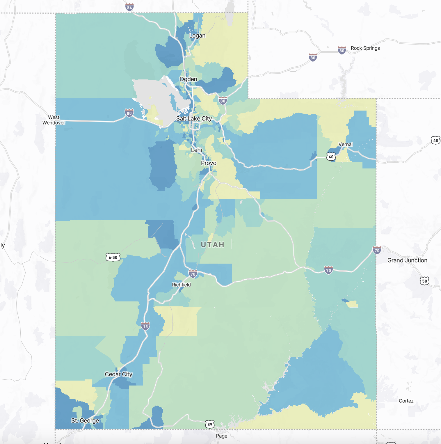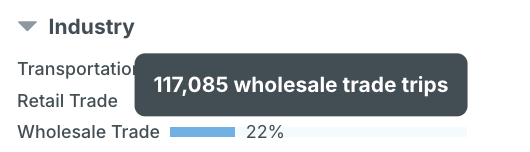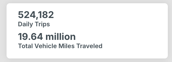 - Modify the metric visualized on the map based on the selection made in the “Data” dropdown, with options including vehicle trips, vehicle miles traveled, trip share, and trip density.