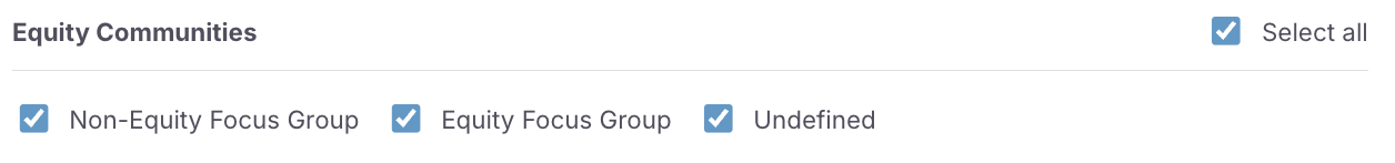 Consider community type aspects by filtering data based on the equity, minority, or low-income status of travelers. The available options are the default community type classification, based on the Justice 40 equity definition, and a user-defined custom community type table.