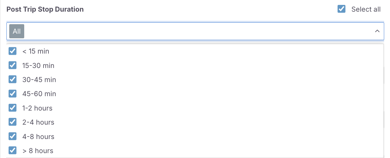 Filter data based on the how long trucks remain stationery at the destination after a trip has ended.