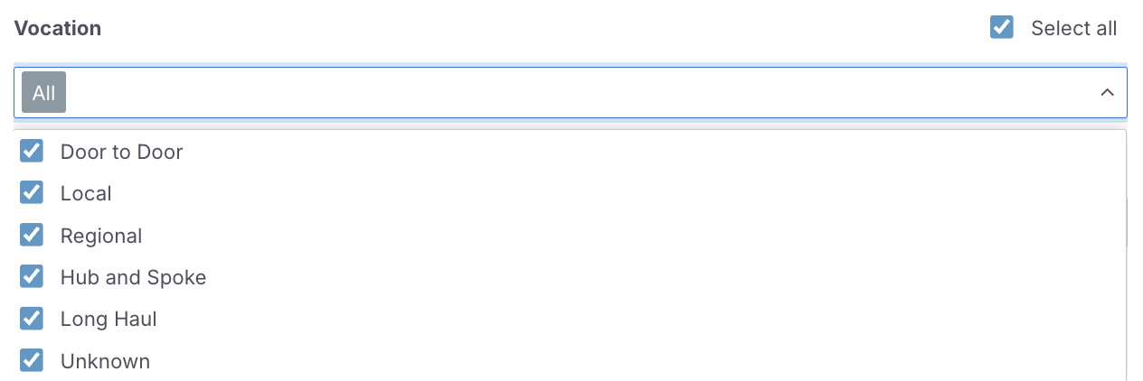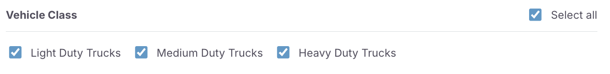 Filter data based on specific vehicle classes. Available options include light, medium, and heavy-duty trucks.