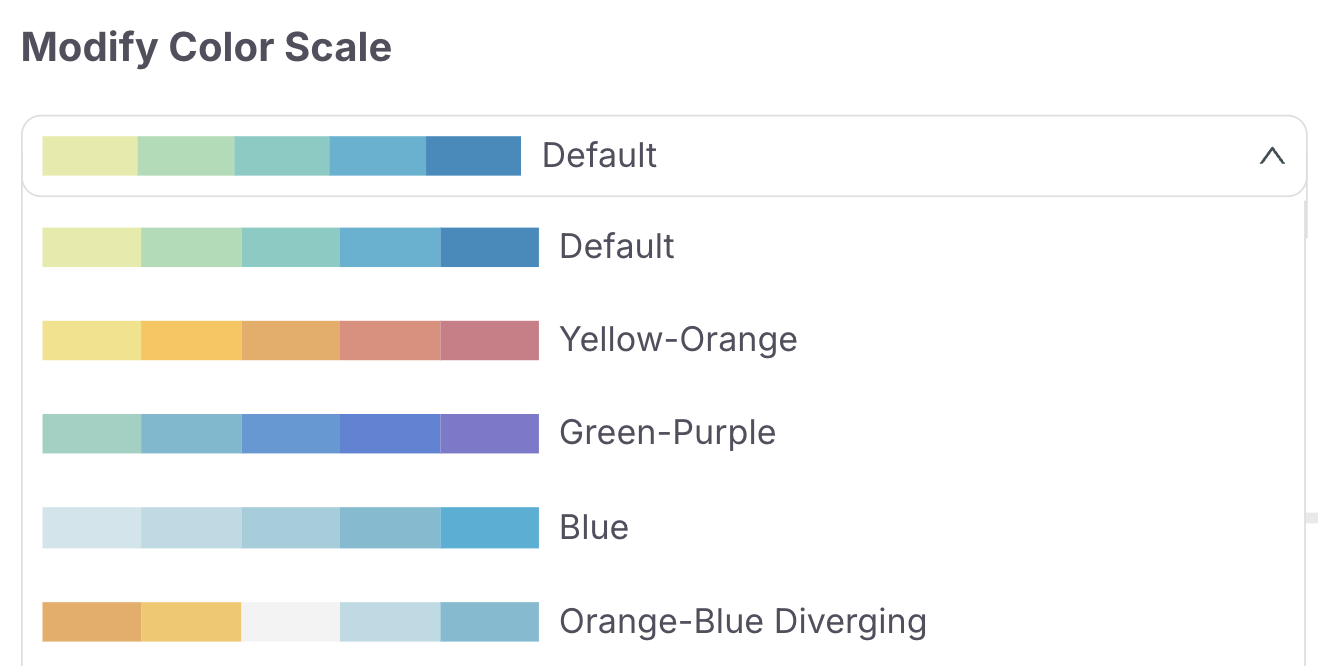 The color scale customization options allow you to visualize the map according to your personal preferences. Modify the colors of the scale by selecting from a dropdown.