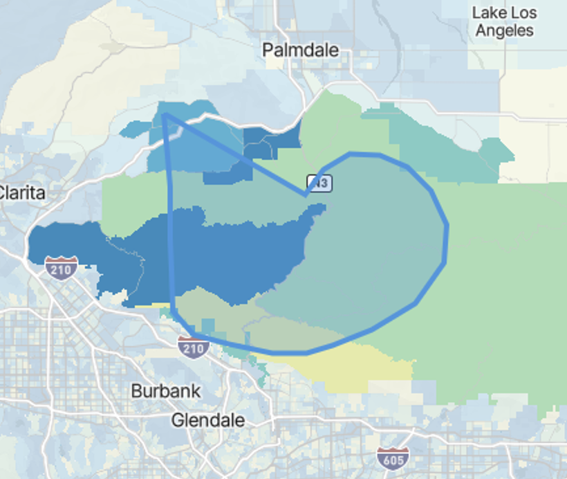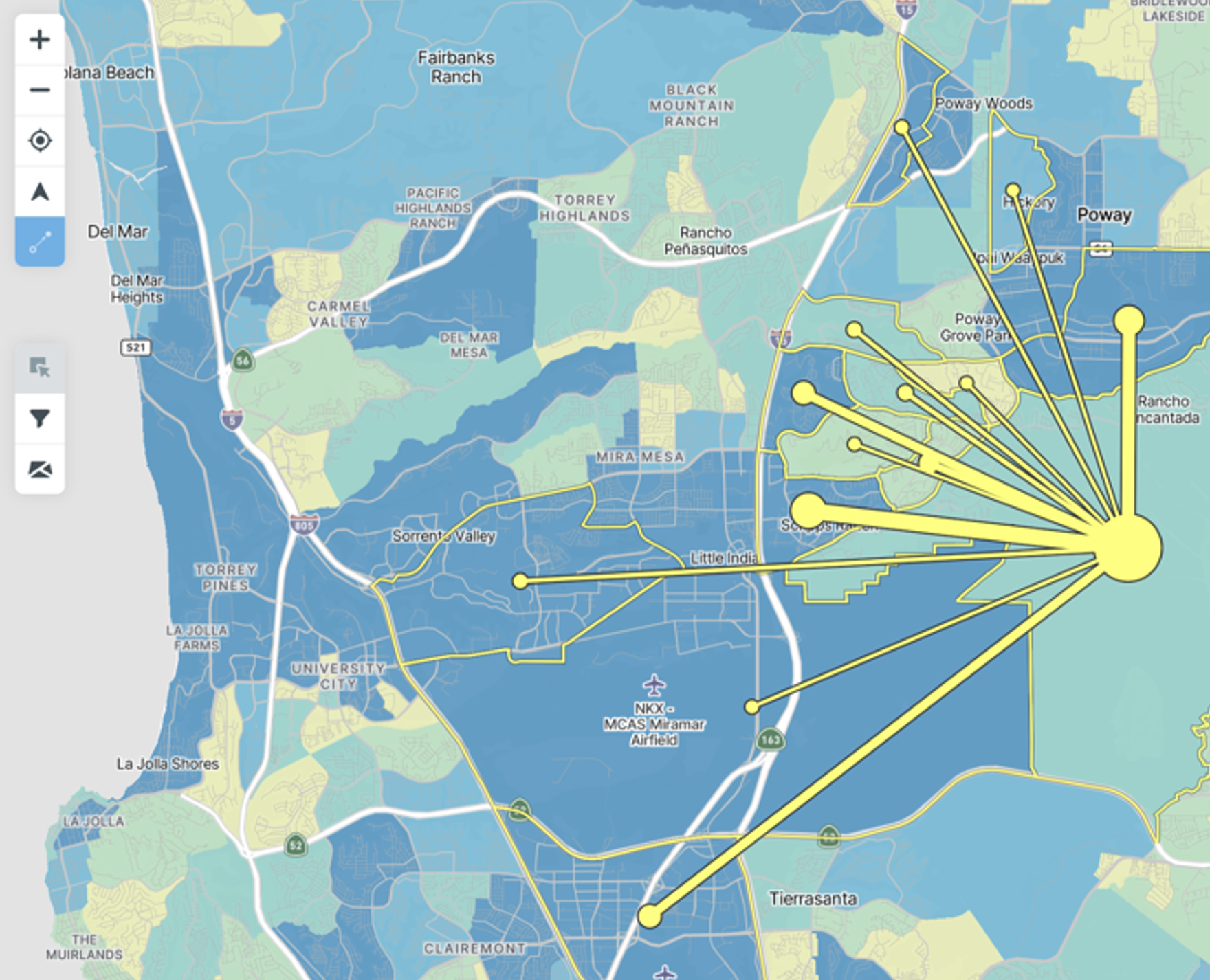 Once a map layer has been selected, users can apply a buffer in miles for a particular map layer to select the zones that fall within the radius and conduct additional analysis.