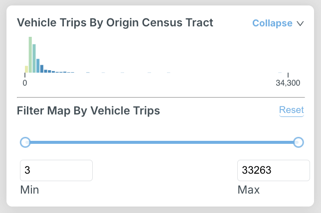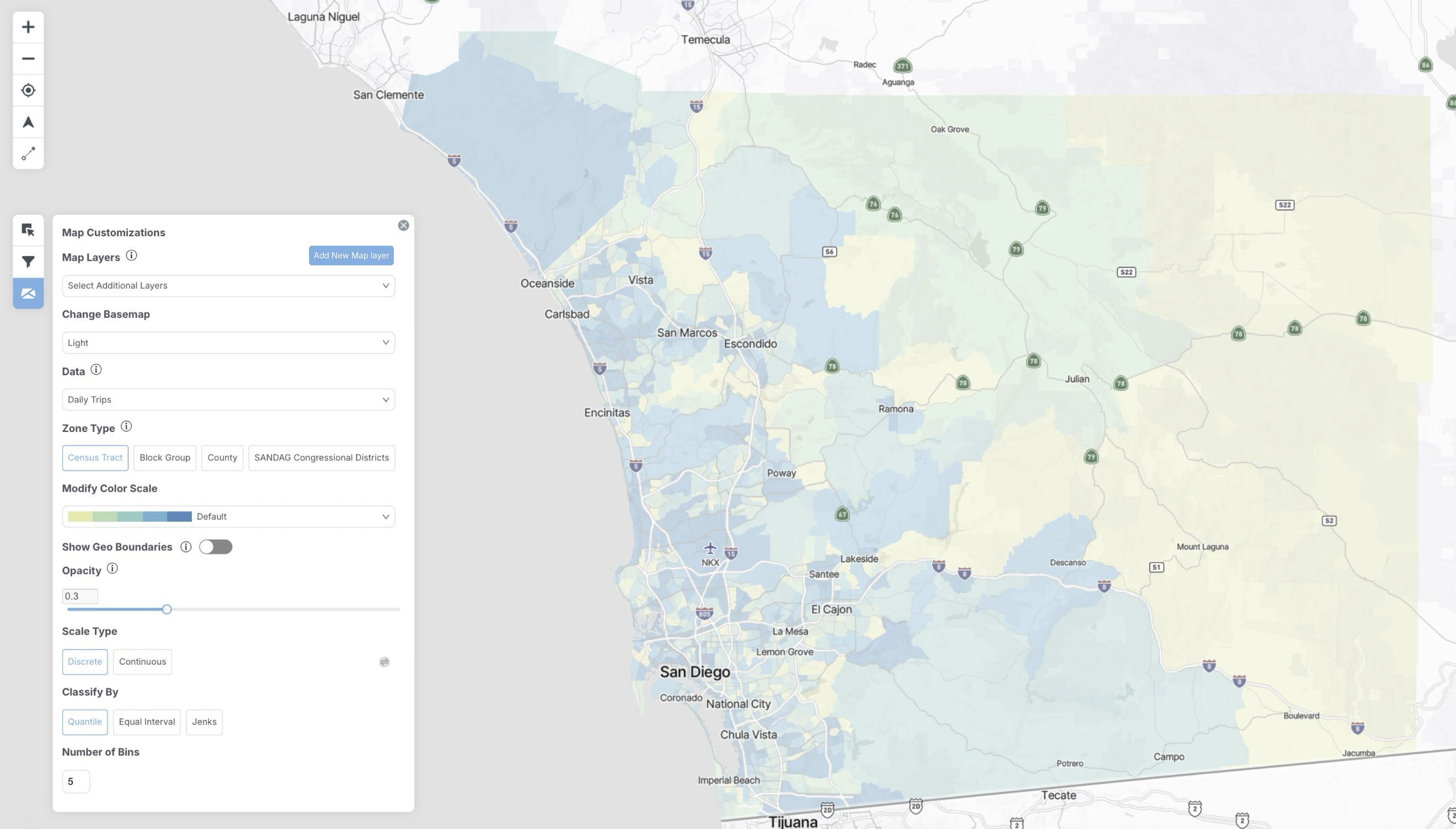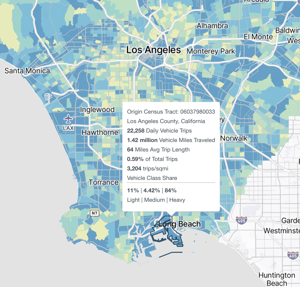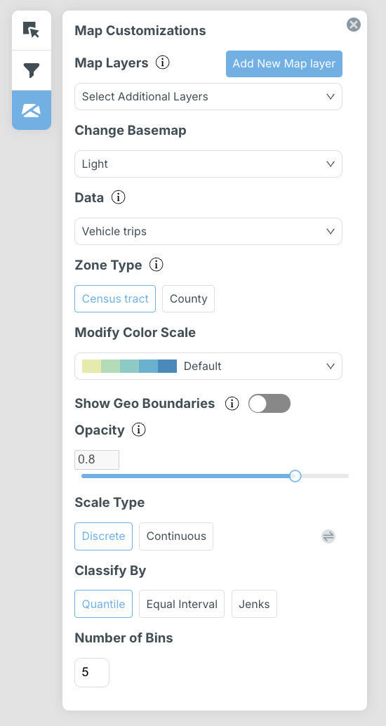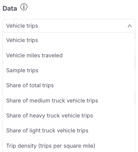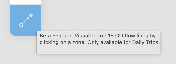 The zone type visualized on the map can also be changed. Options include block groups, census tracts, and counties. If you have uploaded a custom zone system, it will also show up here. When a custom zone is selected, only trips beginning and ending within the custom zone are displayed.