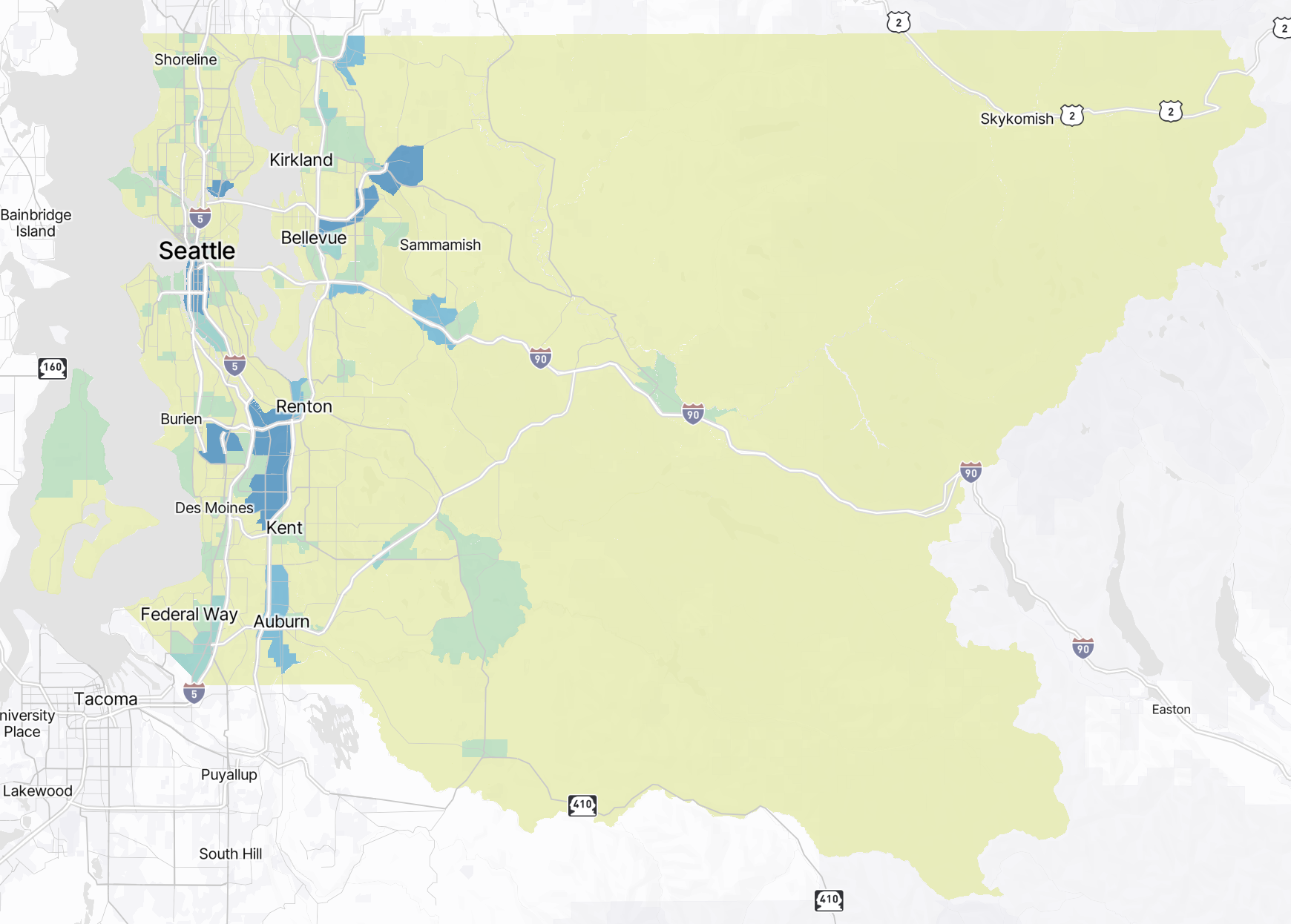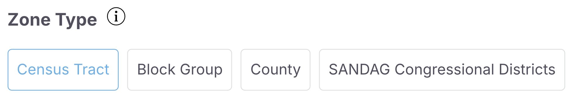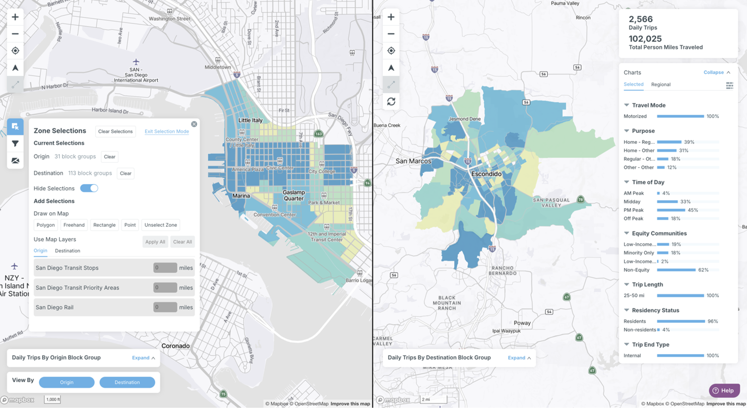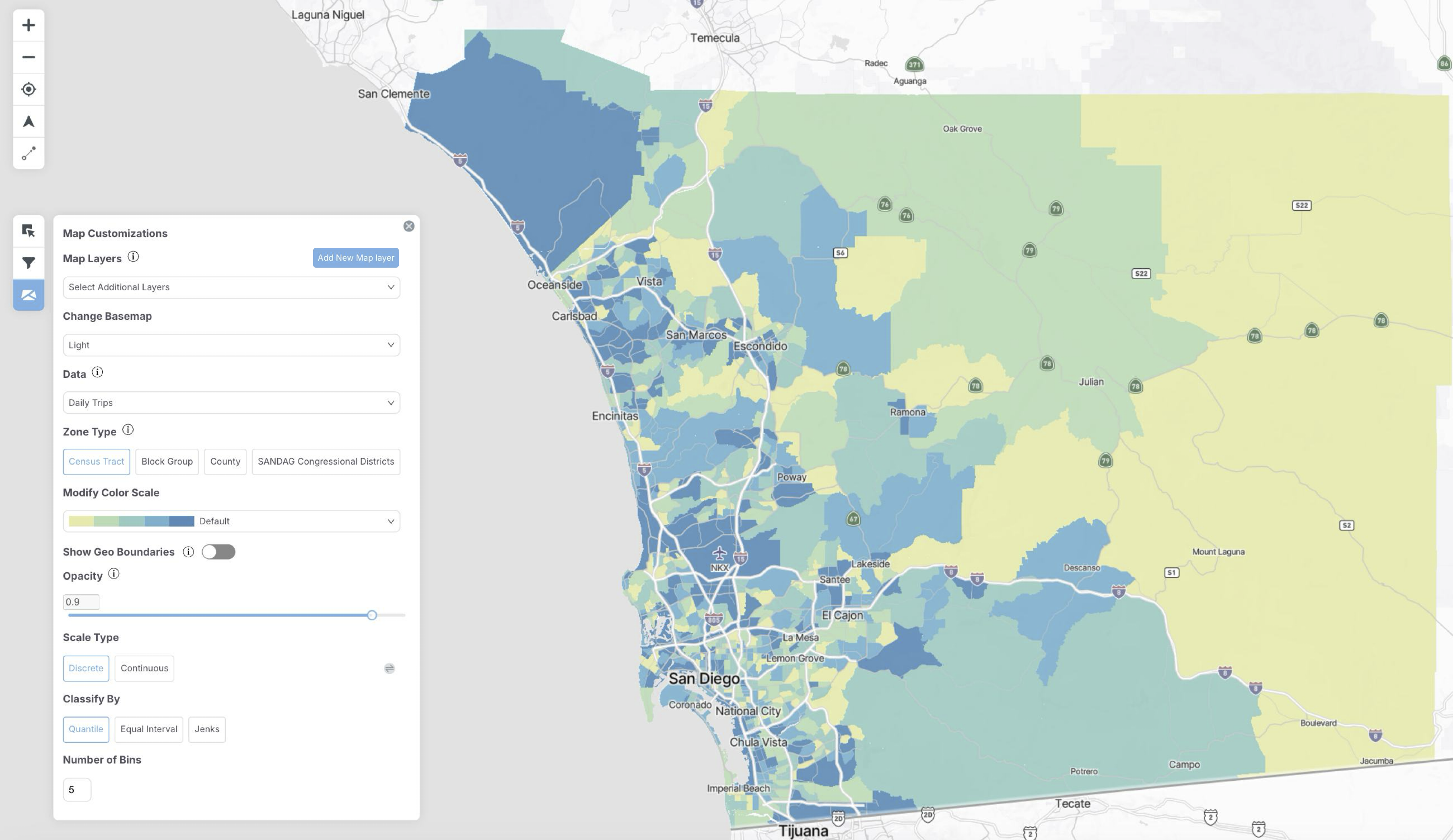 The zone type visualized on the map can also be changed. Options include block groups, census tracts, and counties. If you have uploaded a custom zone system, it will also show up here. When a custom zone is selected, only trips beginning and ending within the custom zone are displayed.