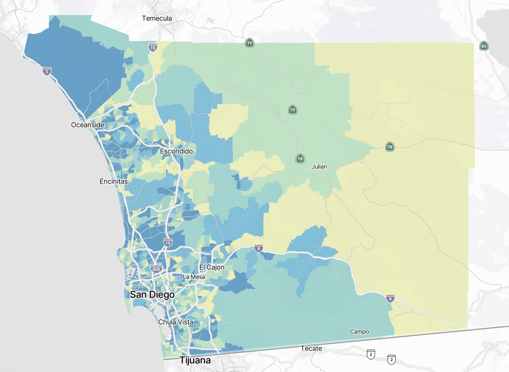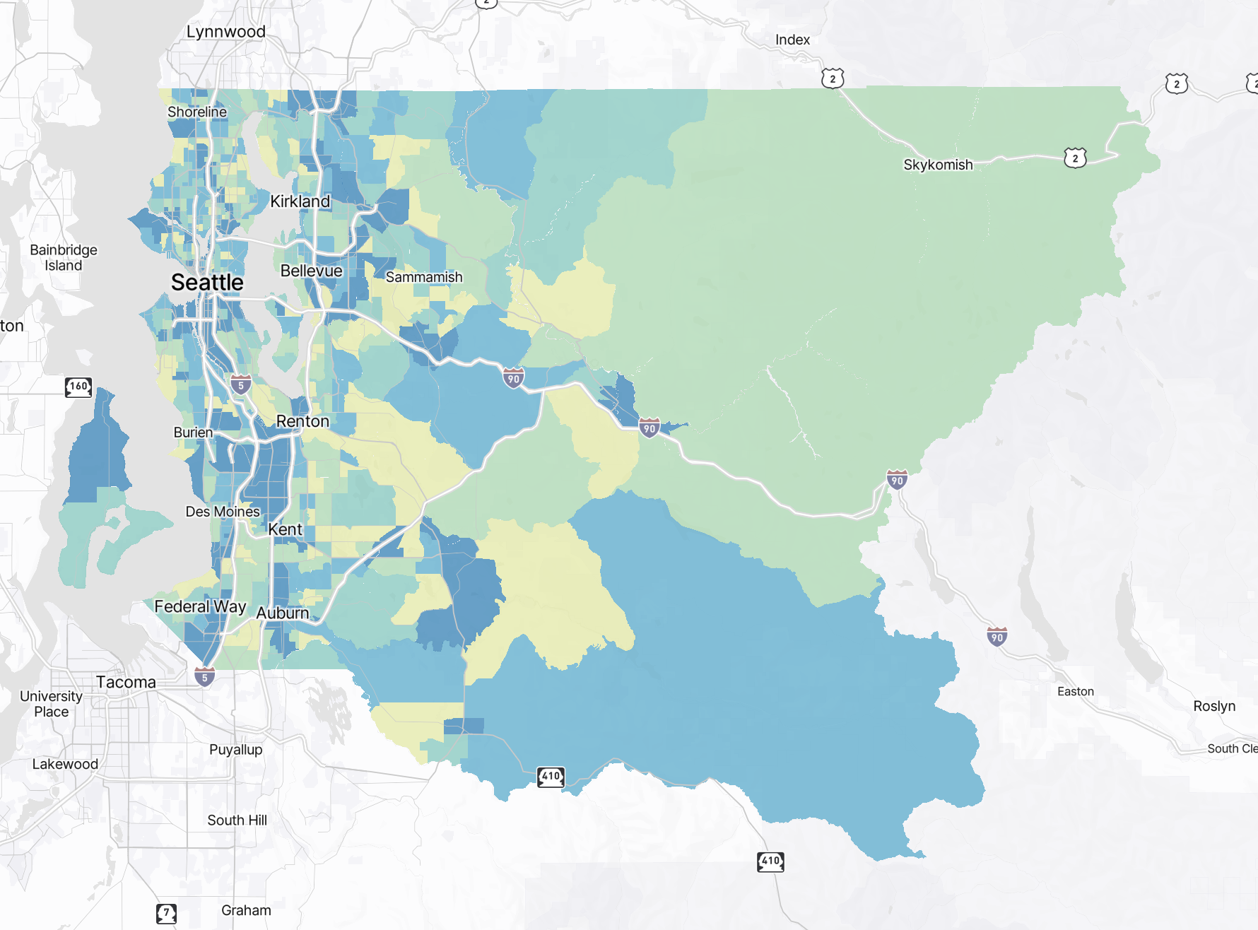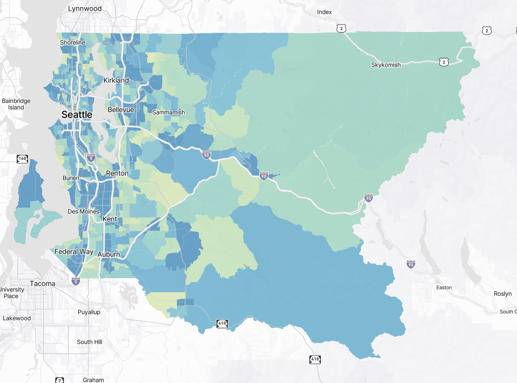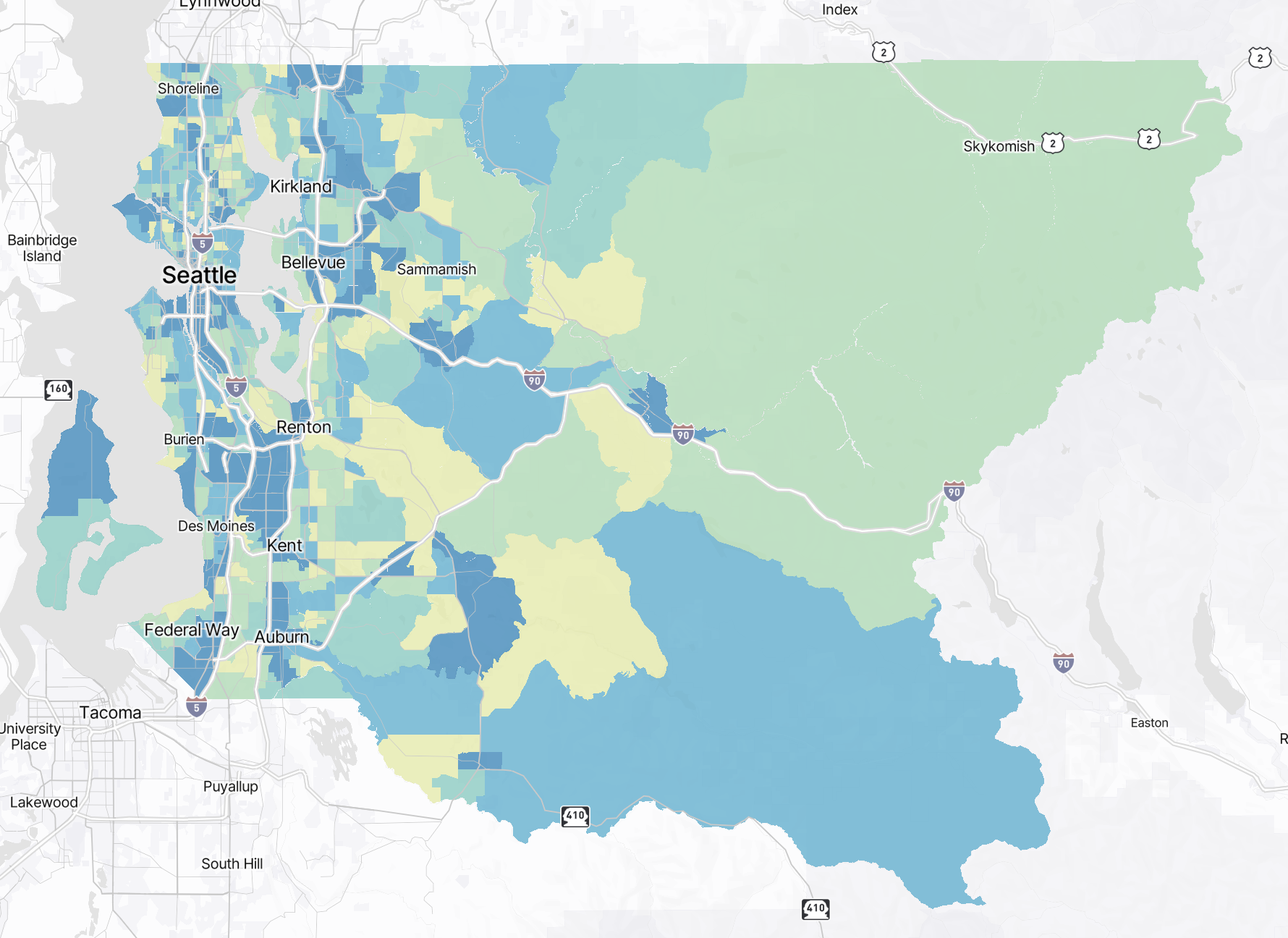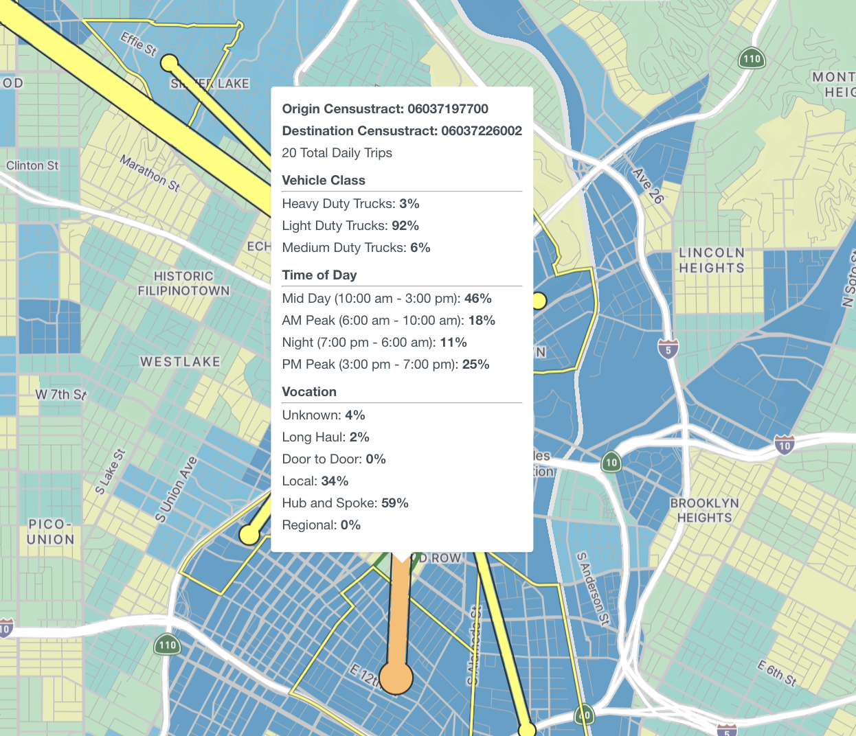 Hovering over different areas on the map will reveal information about the area in question. Hovering over the map will reveal high level metrics and mode share breakdowns for the selected area.