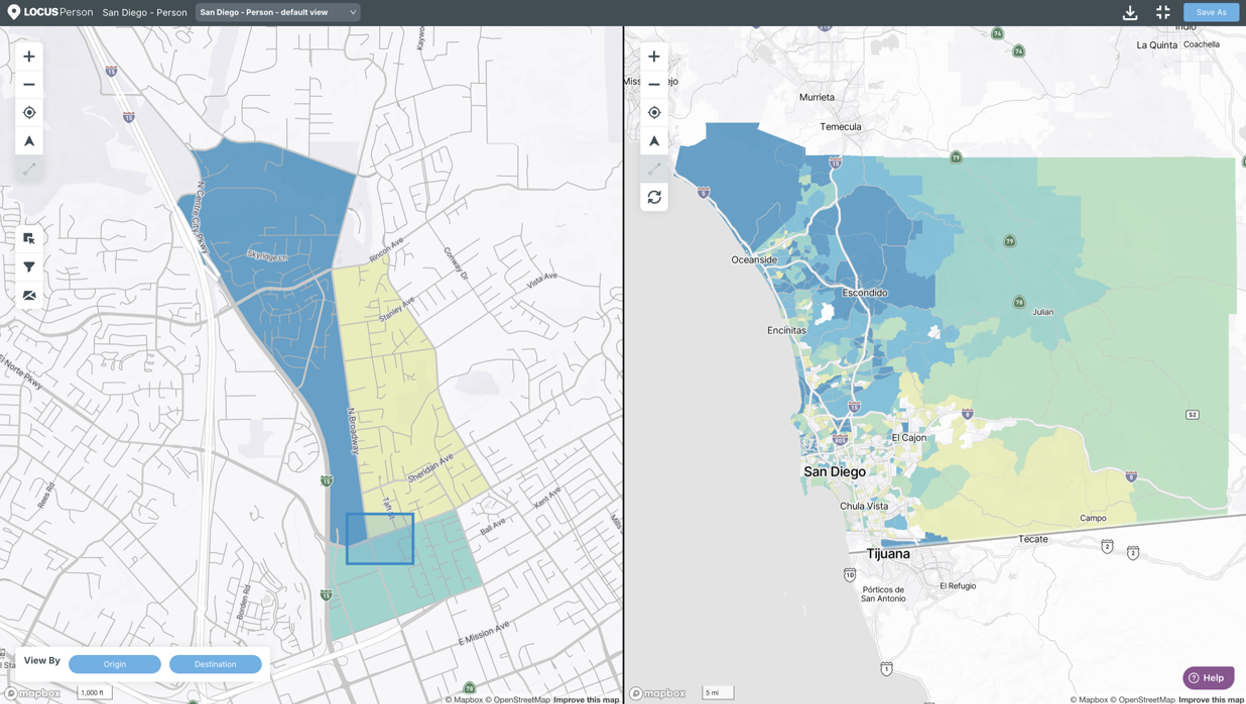 Select both to view origin and destination views in a split screen. In the below example, overlaid components have been hidden to afford more real estate to the maps on the screen.