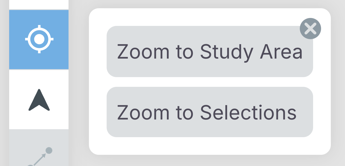 Use this to adjust the zoom level to either fit the study area, or a selection that has been made on the map.