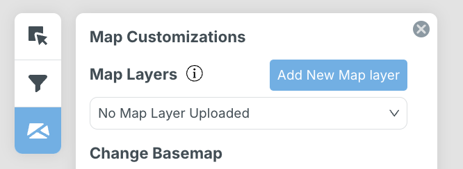 During project setup, users can upload map layers for additional analysis. These layers can be made visible in the “Map Customizations” panel (more information on this can be found in a subsequent section). Map layers can also be uploaded after project creation, by choosing between layers uploaded by you and map layers preloaded into the system.