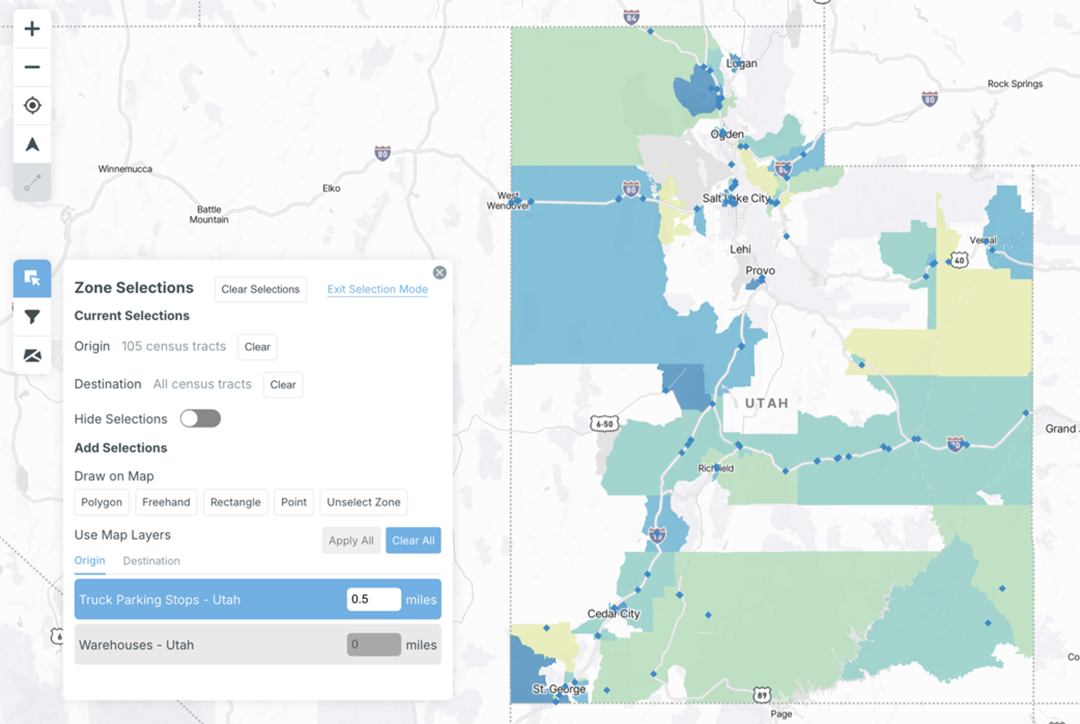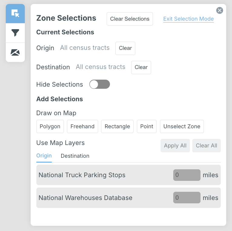 Make a series of zone selections by drawing directly onto the map or utilizing map layers. “Current Selections” will display the number of origins and/or destinations selected. Geographic resolutions are based on the zone type selected in the data tab (Section 5.2.5).