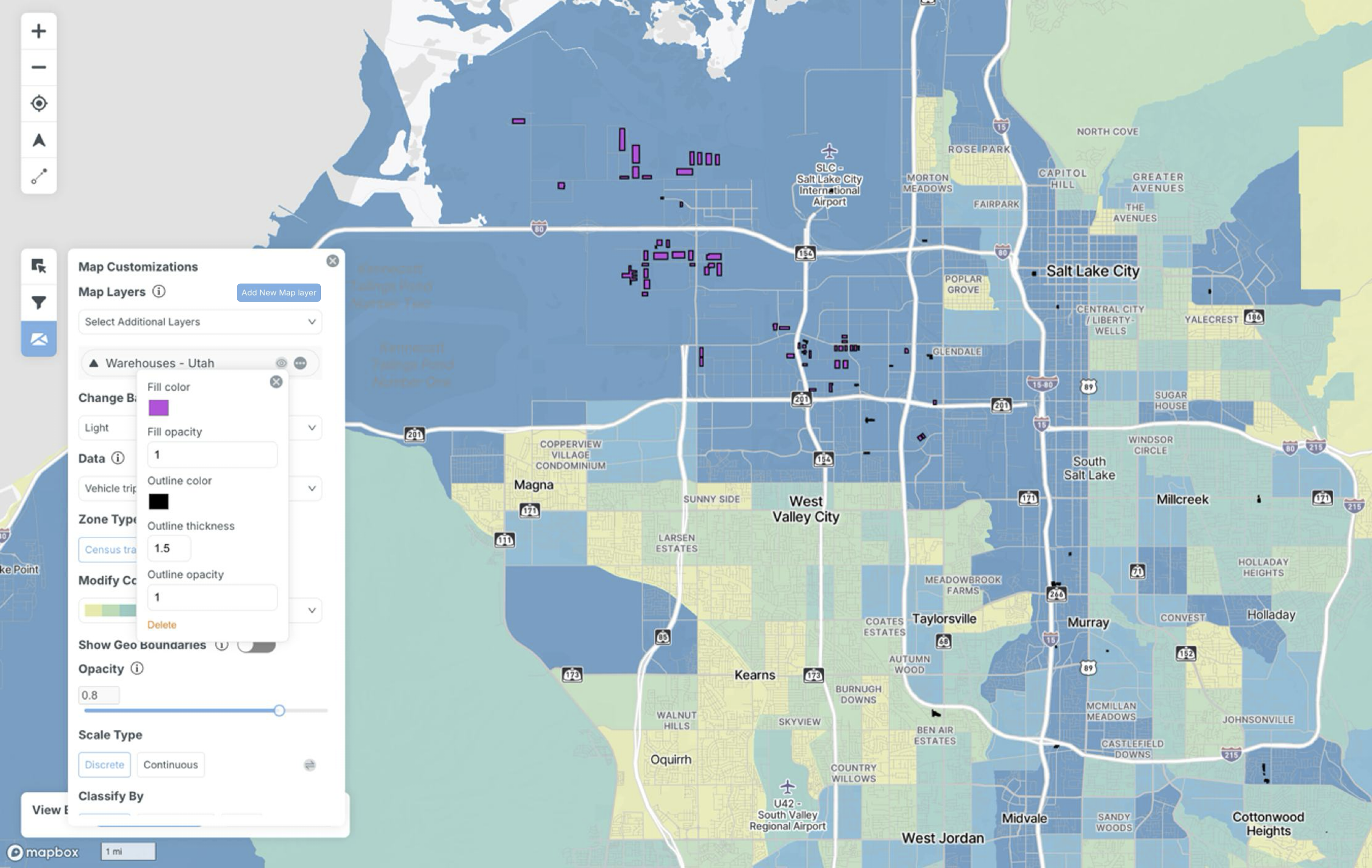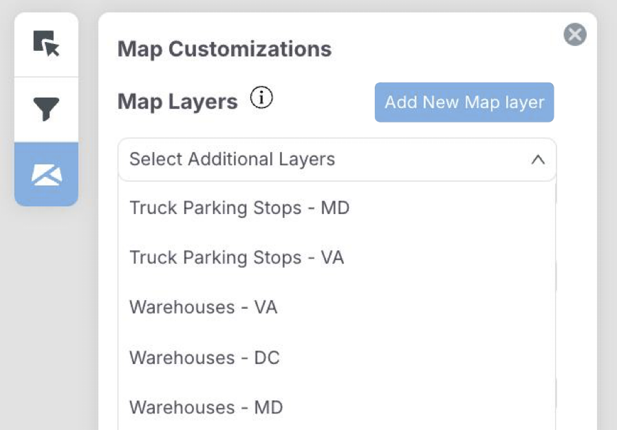 Map layers can be further customized by assigning color, size, and opacity, and can be hidden if needed.